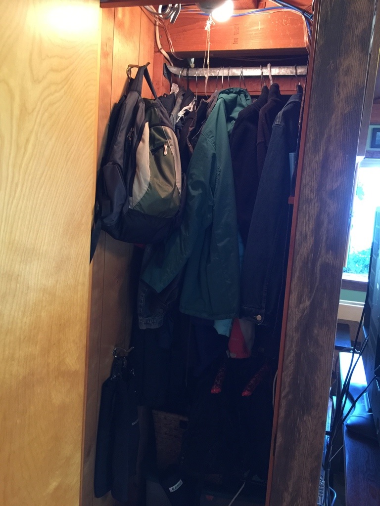Sorry, but my closet is not a shallow set of cubbyholes designed to hold yellow galoshes in singles. Mine is more like the Black Hole of Calcutta. The area behind where those coats are hanging? Astronomers call that the Event Horizon; beyond that point, nothing can escape, not even light.
