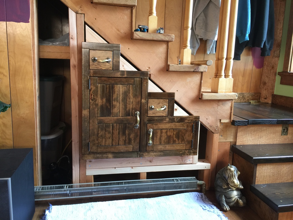 The logistics of this was actually a little tougher than I thought. The little heating thing down there meant I couldn’t make these cabinets all the way to the floor, they’d need about a foot of clearance, so that right there eliminated 12 cubic feet of storage space that I’ll never get back.