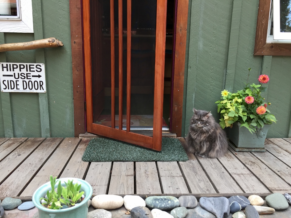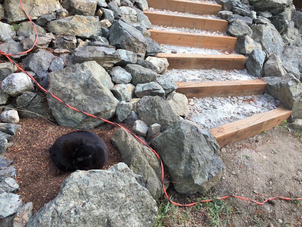 Yeah. You see, we have these little hot water radiators that heat the house. They work ok. I guess. But you can’t really put furniture in front of them or you lose all that heat. Plus, the furniture doesn’t go right up against the wall. Ergo, I mounted my bookshelf up on 2×4’s and installed it into the wall. The resultant space beneath the bookshelf was a favorite cat hangout, due to the nice warmth it gave and the opportunistic view of the birds out the back door.