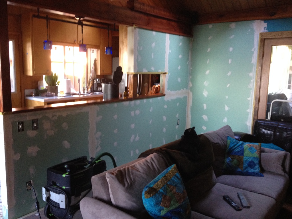 I discovered that I really suck at drywall. But that’s okay. It looks good, it’s solid and durable, and it doesn’t smell like cigarette smoke and dog pee (which is what the old paneling smelled like). The joints and seams are not that visible if you just avoid certain kind of lighting. It’s all good.
