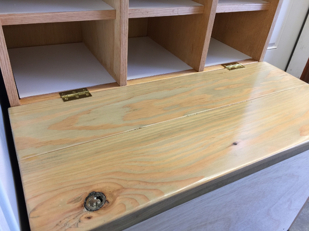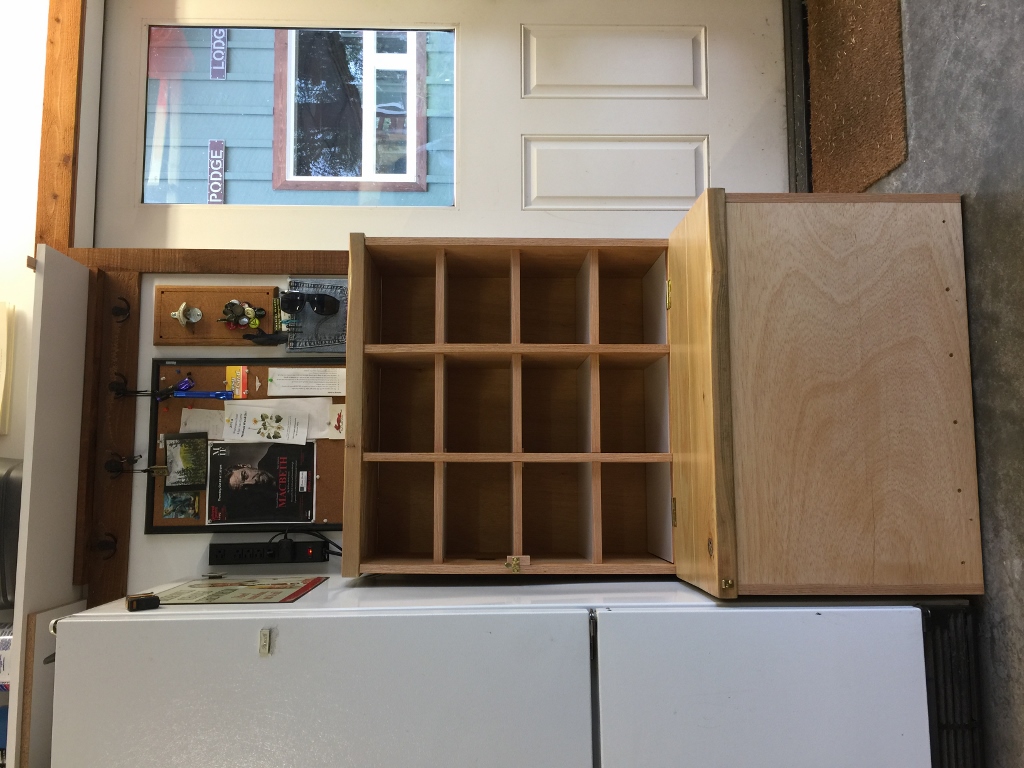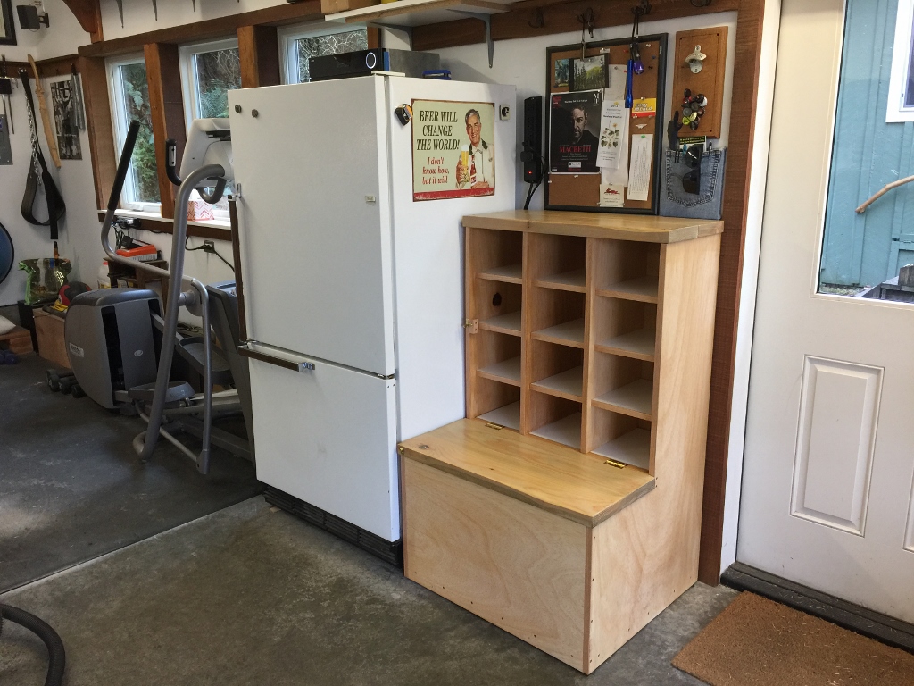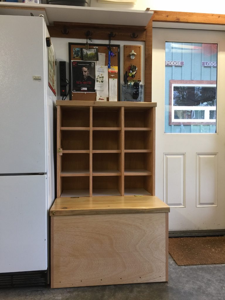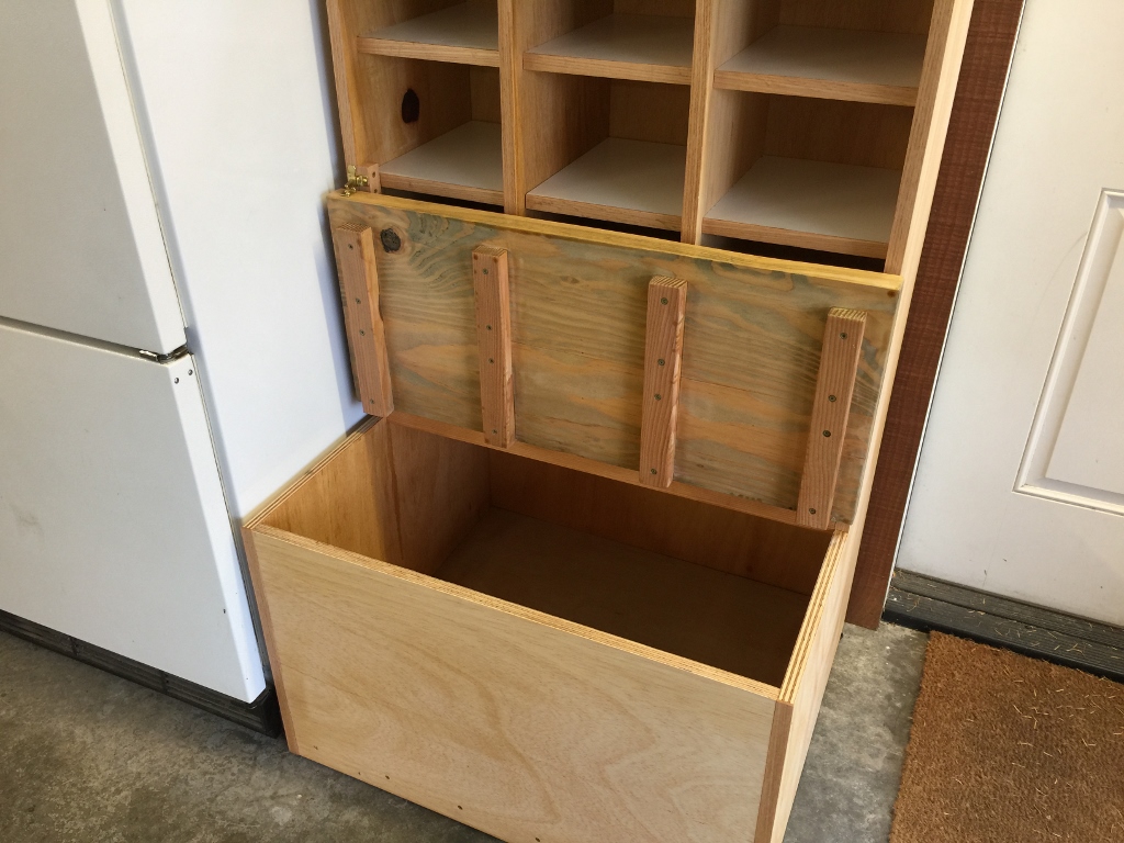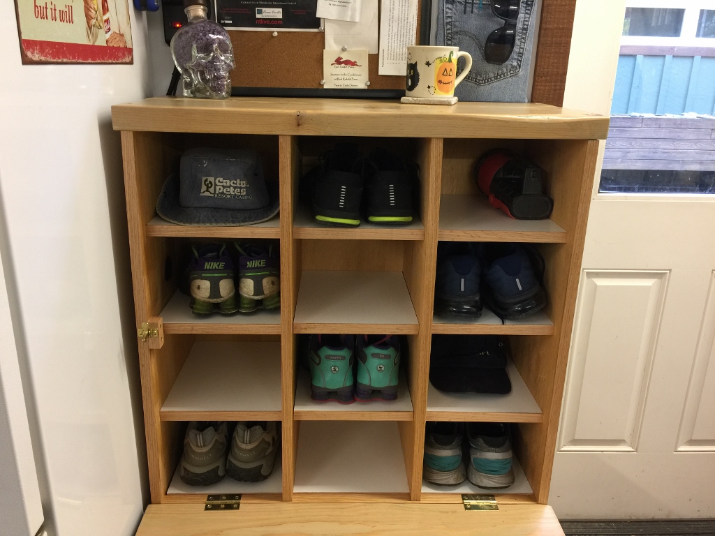 Yeah, now we’re talking. A little plywood, some lumber, a few pieces of hardware, and suddenly we have a space to store a dozen pairs of shoes, with a place to sit to put shoes on, and a storage trunk to store whatever you want!