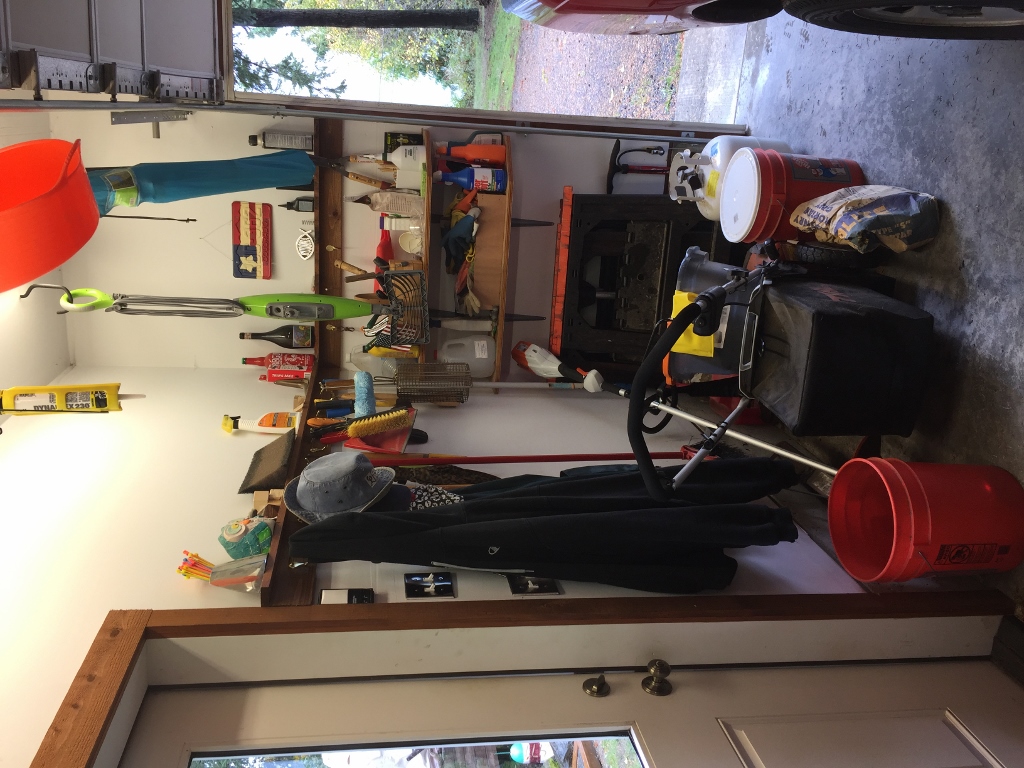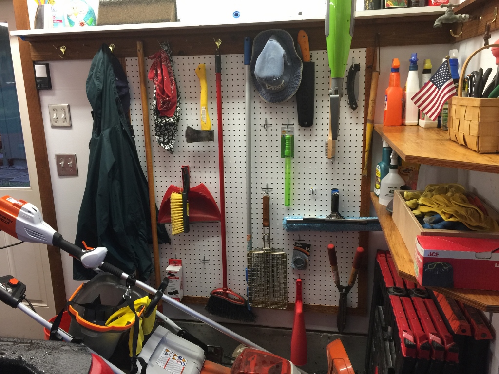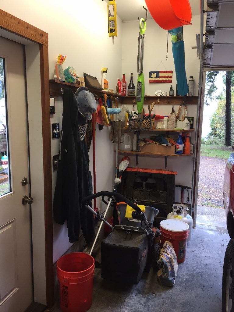 This has been a cluttered corner for a long time. Things go here when they have no place else to go. Gardening tools, bags of mortar, sawhorses, bicycle pumps, camping chairs, floor steam cleaners. Hey, it’s what a garage is for, right?