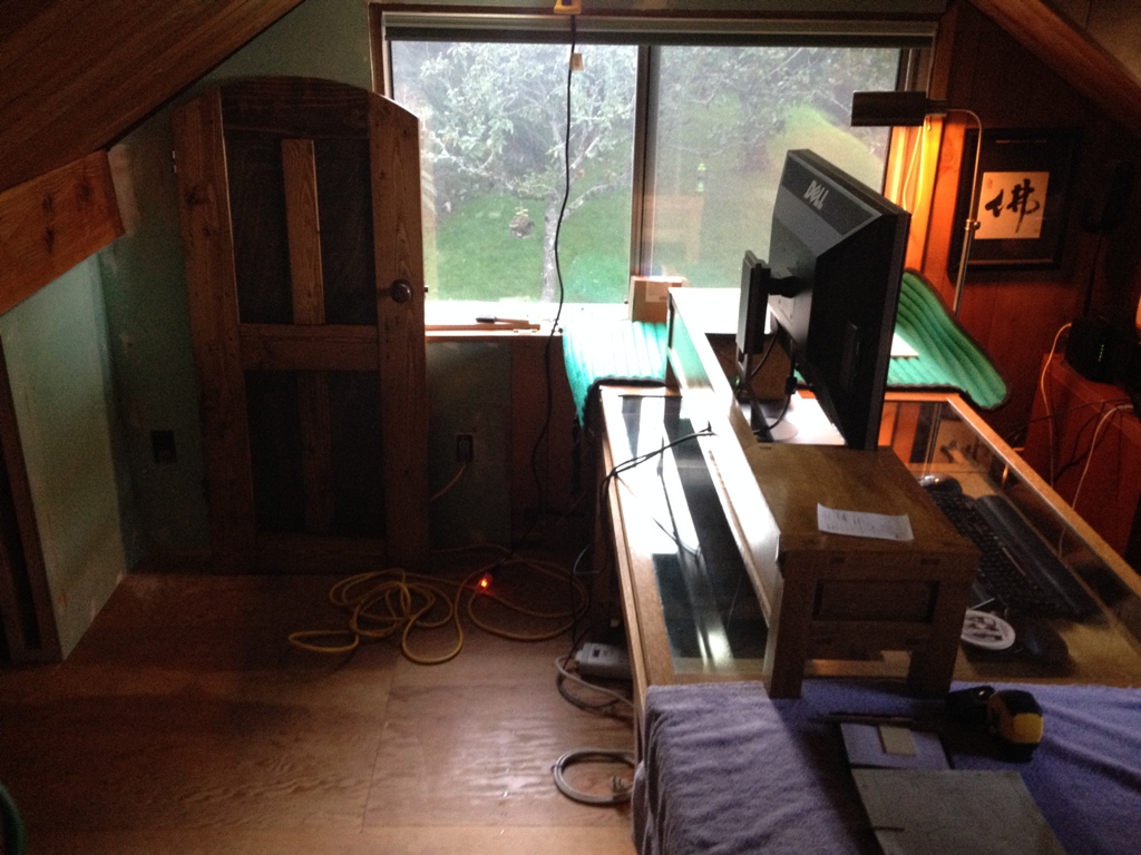 For a week, my desk was pushed against the opposite wall to make room for all this work. To access my desk, I had to crawl underneath it and sit on its opposite side. That was fun. (And look on the right hand side, some paneling I haven’t yet gotten to.)