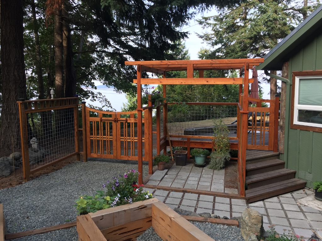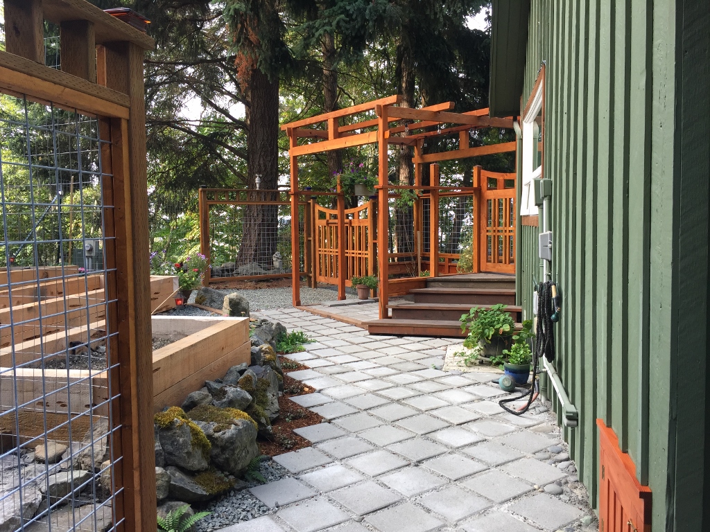 We’ve been busy little beavers out there. Deer fence is up, pergola is up, planting beds are in, patio pavers are down, it’s like we added on to the house with this big outdoor space.