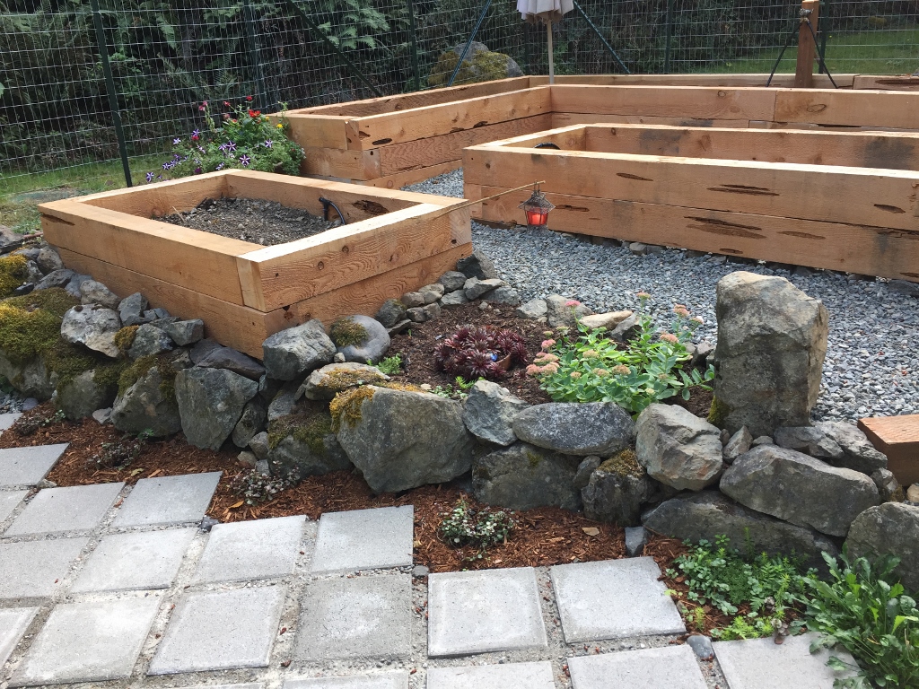 The planting areas are coming along nicely. We put sedum down in the rocks so they can spread out a bit and fill the openings.