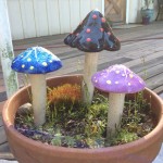We did keep a few pots.  If you look closely at the pic of the one with the mushrooms you’ll see the snail I found today.  He seemed pretty happy and looked right at home with the mushrooms and weeds and moss and stuff.  It’s been critter overload around here lately; bees the size of dogs, bald eagles, raccoons, turkeys, deer, you name it.