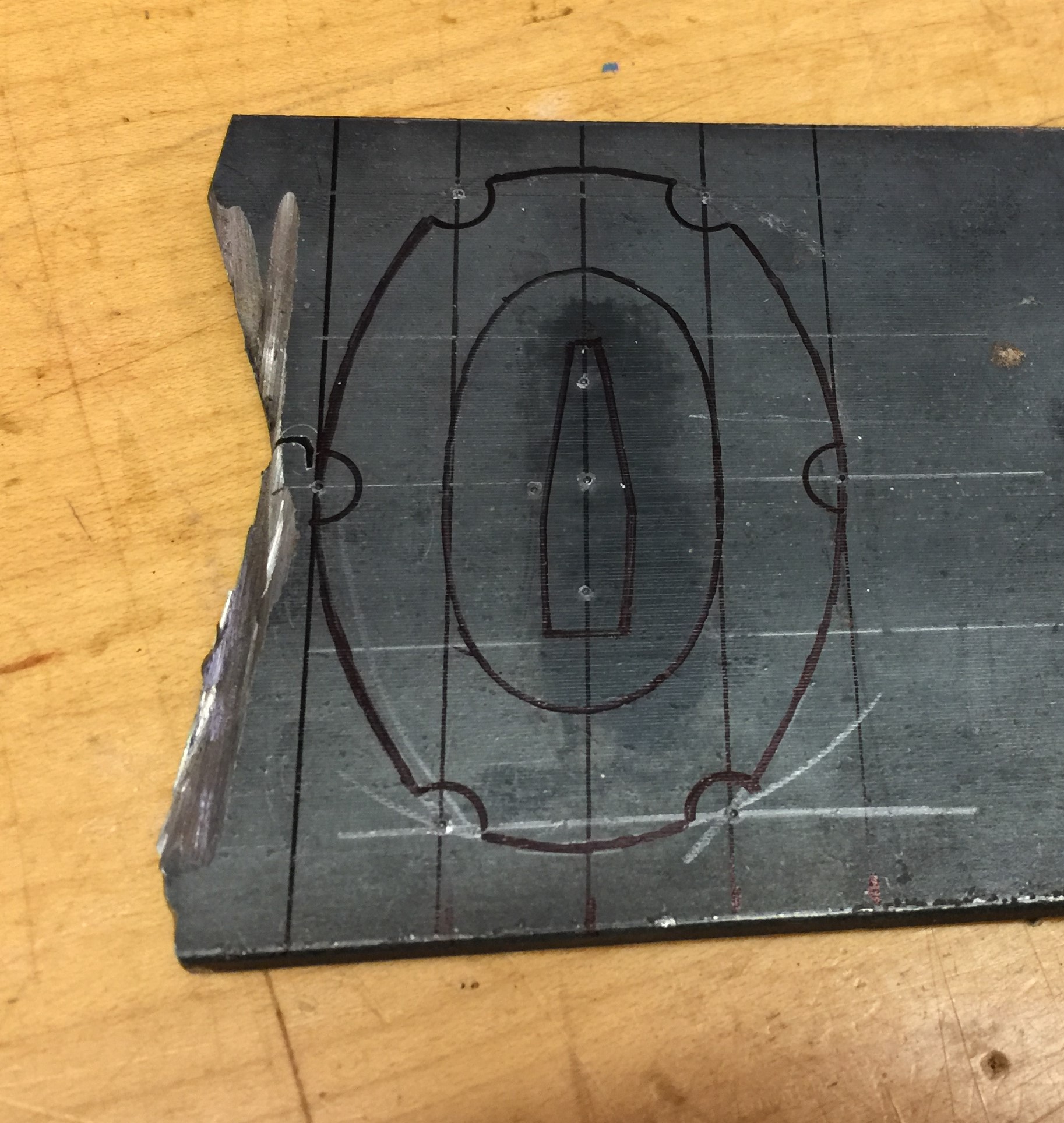 I lay out what I think I want it to look like on a slab of 5/16″ steel.