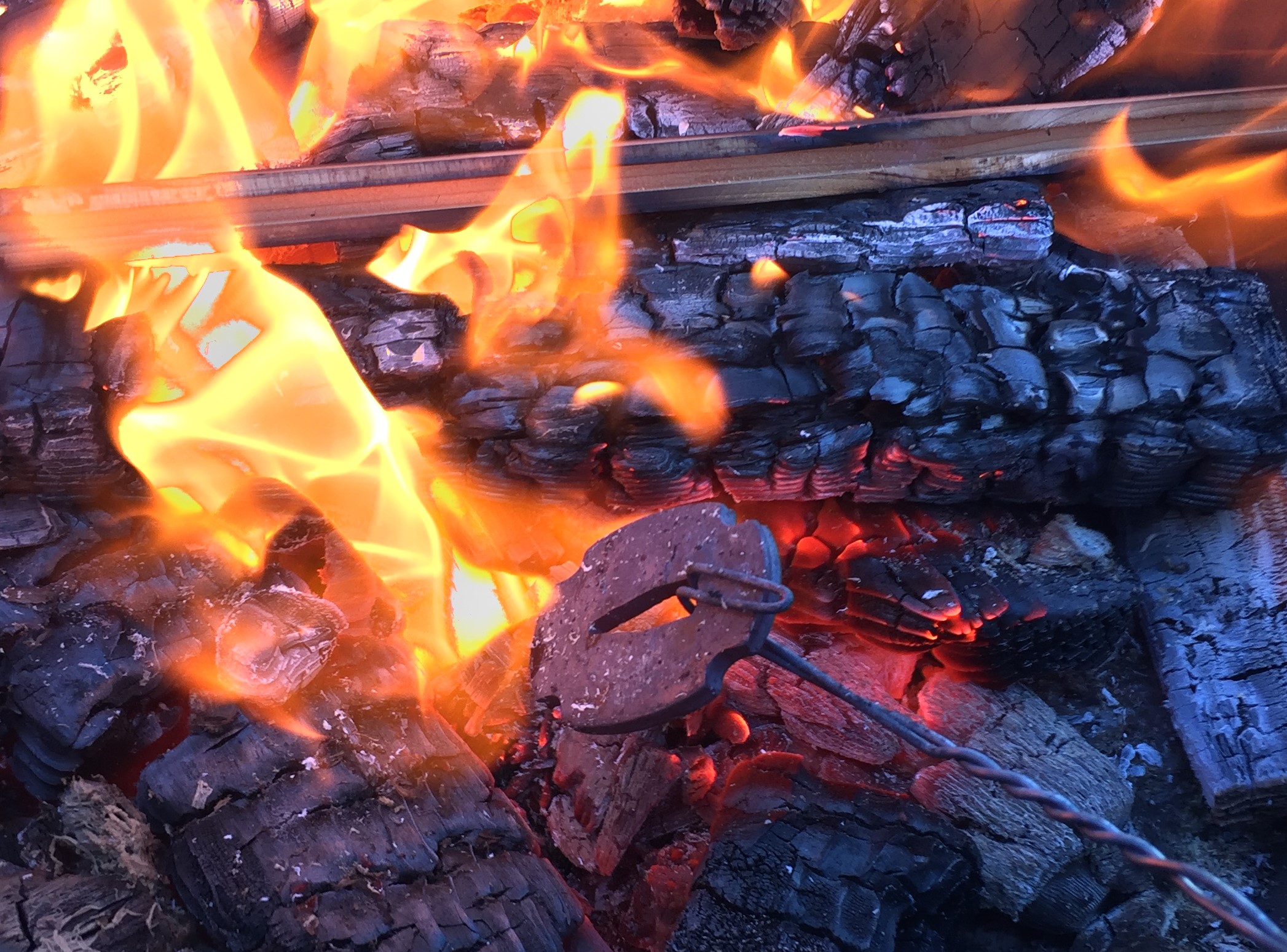 Heat treating is the fun part, and not without some risk. The tsuba is heated in these embers until it’s glowing hot, and then quenched in water. This sudden cooling will harden the steel quite well, but if there are flaws in the steel, it may crack or deform, and then I’d have to start all over.